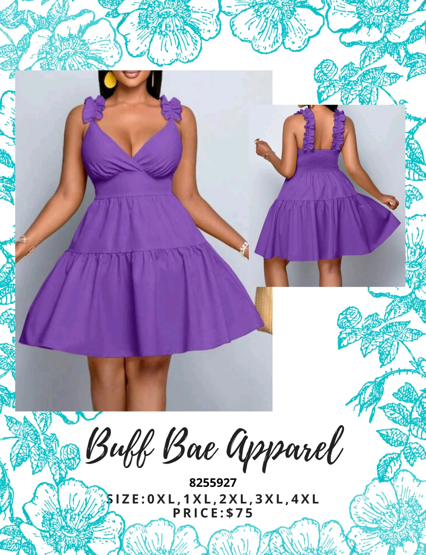 This is a purple mini dress with ruffle straps and a tiered skirt. It features a shirred back and a V-neckline. Available in sizes 0XL, 2XL, 3XL. Material is not specified.