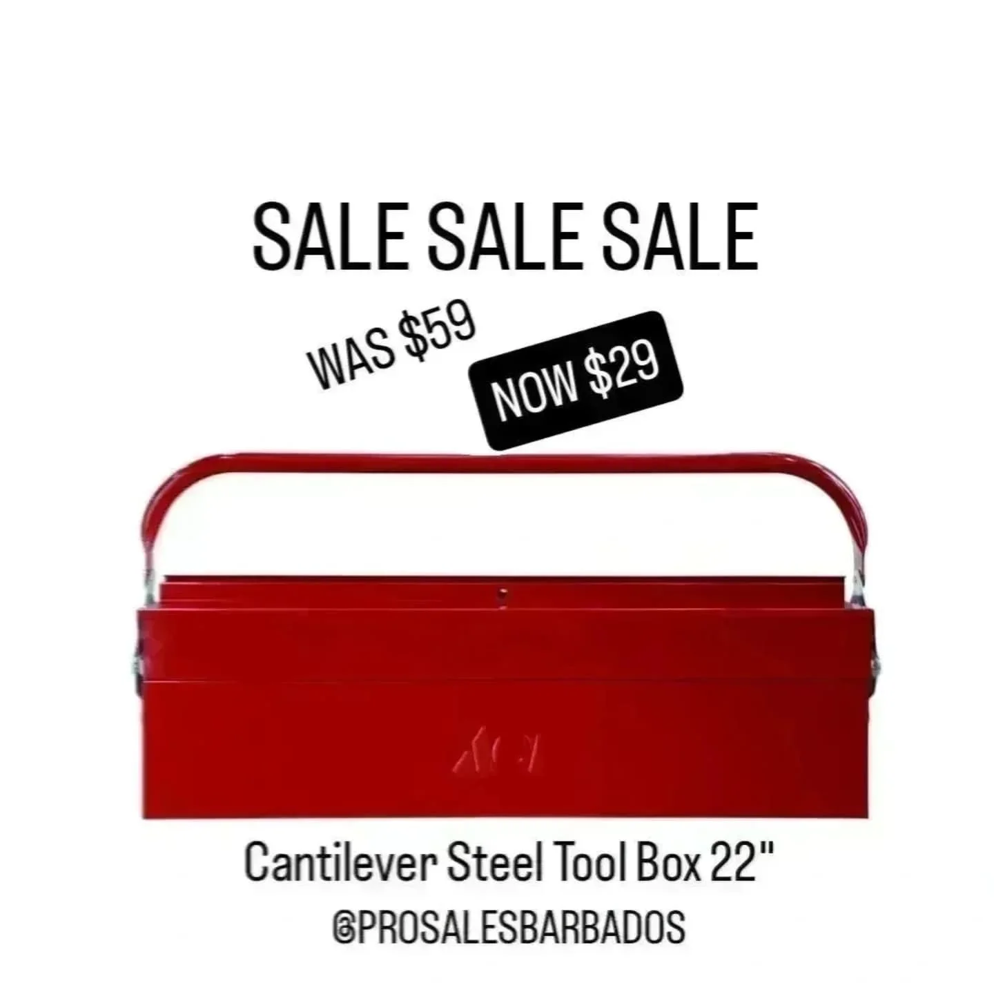 This durable red ACE cantilever steel tool box measures 22 inches, offering ample storage for various tools. Its robust steel construction is ideal for organizing and transporting your equipment.