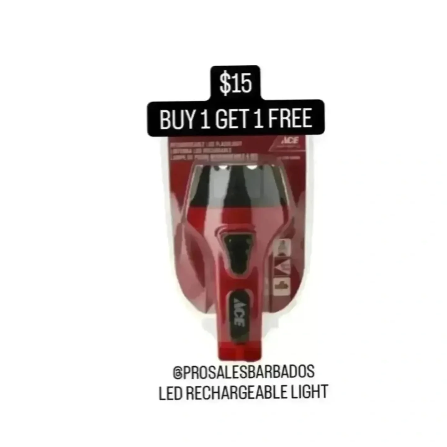 This is a red and black ACE brand LED rechargeable flashlight, presented in its original packaging. The product is offered with a ‘Buy 1 Get 1 Free’ promotion.
