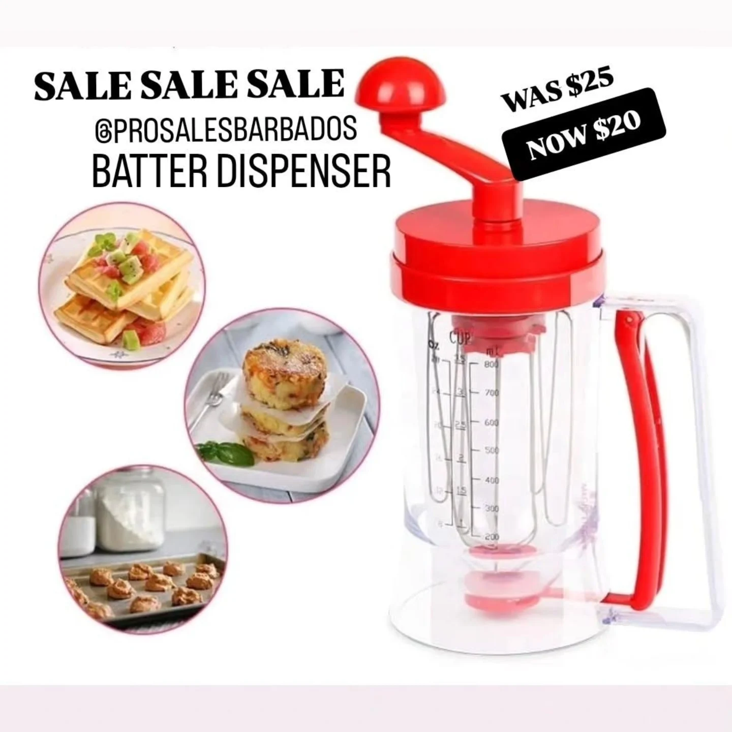 This batter dispenser features a clear measuring container and a vibrant red lid and handle. It’s designed for precise pouring, making it ideal for pancakes, cupcakes, and other baking recipes.