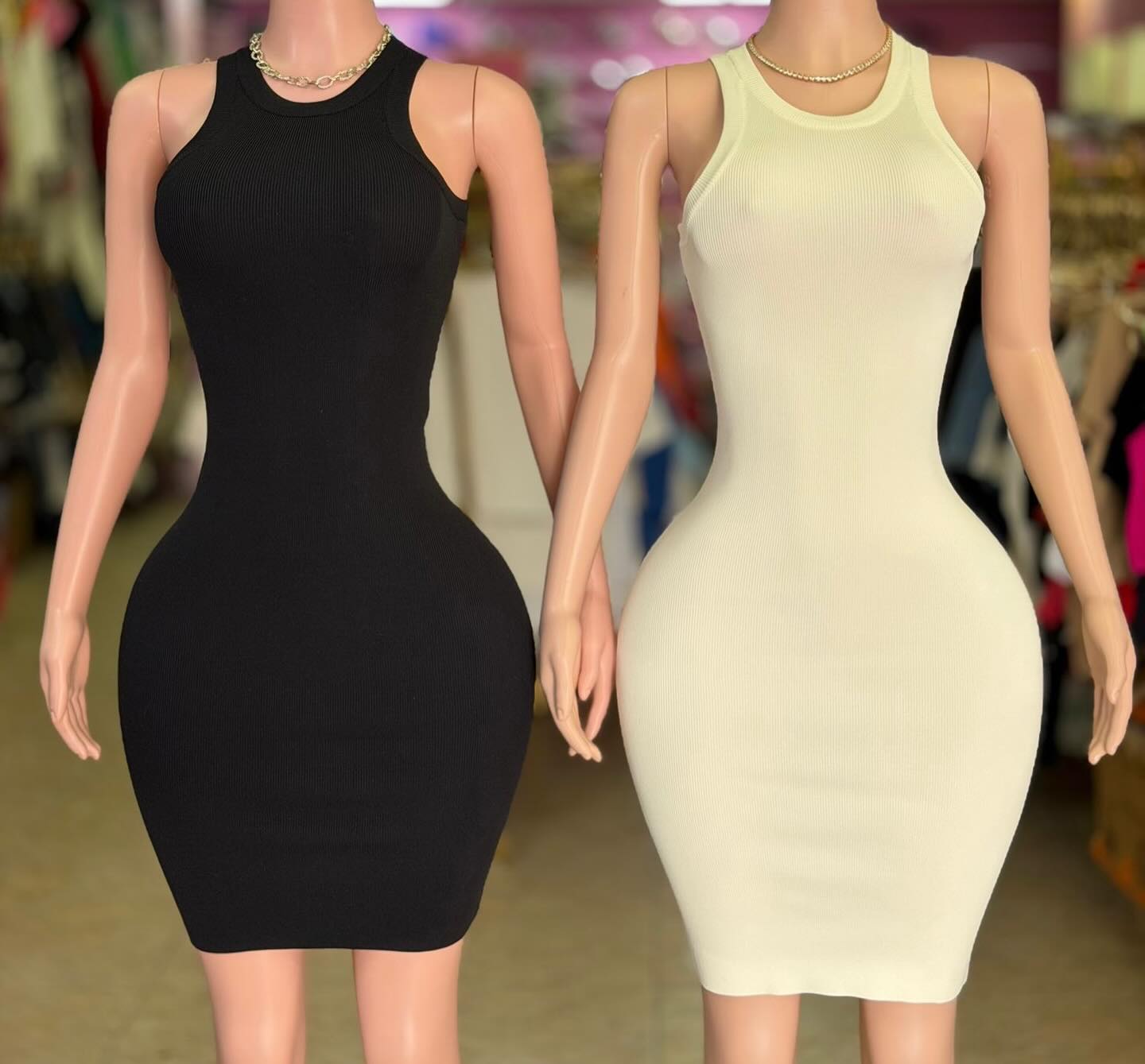 This is a ribbed mini dress available in multiple colors. It features a sleeveless design and a form-fitting silhouette. Available in sizes S, M, and L.