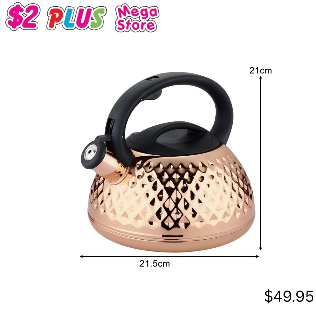 This elegant rose gold whistling kettle features a distinctive textured, diamond-patterned body and a comfortable black ergonomic handle. Designed for stovetop use, it measures 21cm in height and 21.5cm in width, making it a functional and stylish addition to any kitchen.