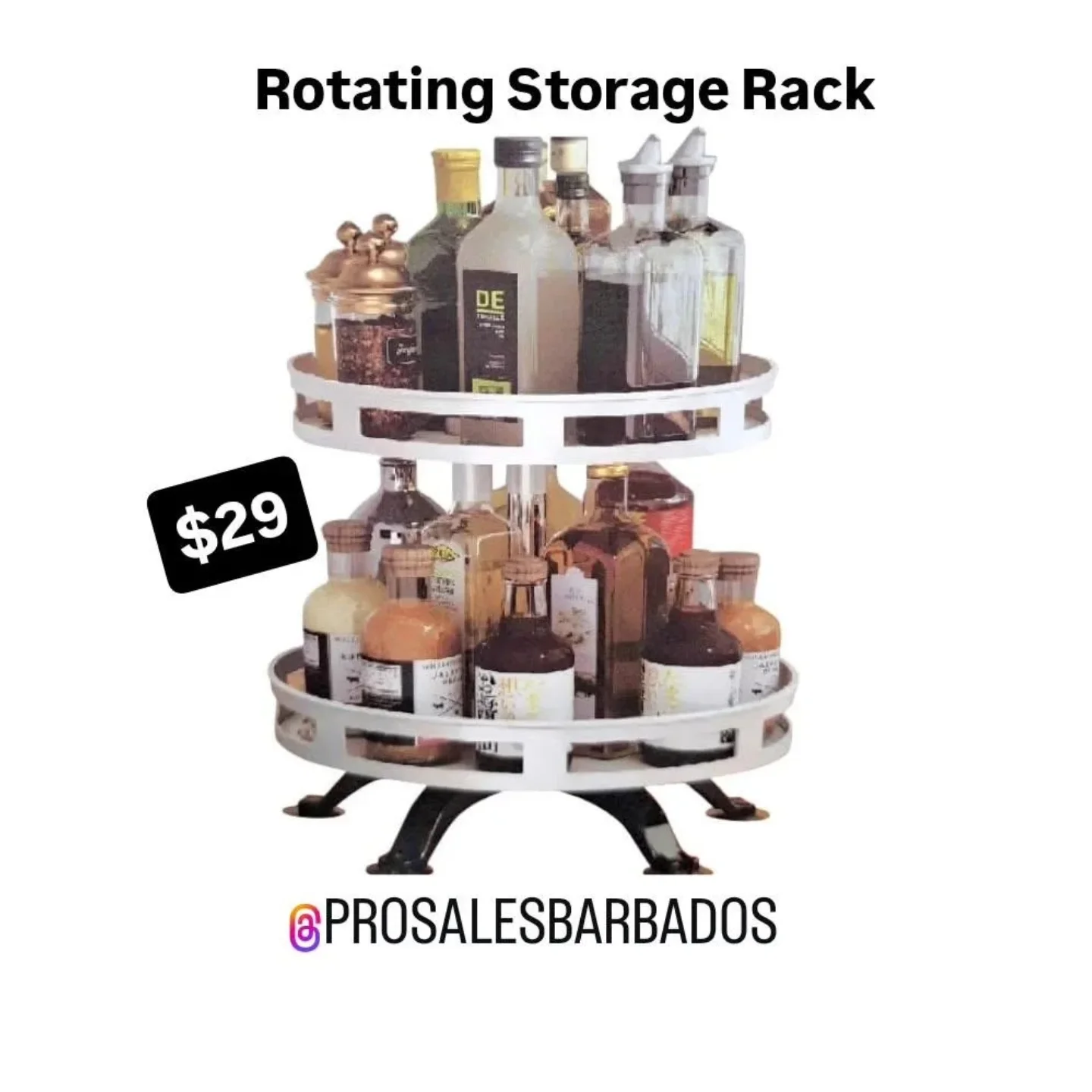 A versatile rotating storage rack with two levels, ideal for organizing bottles or small items. The white rack provides easy access and is perfect for use in the kitchen or pantry to maximize space efficiently.