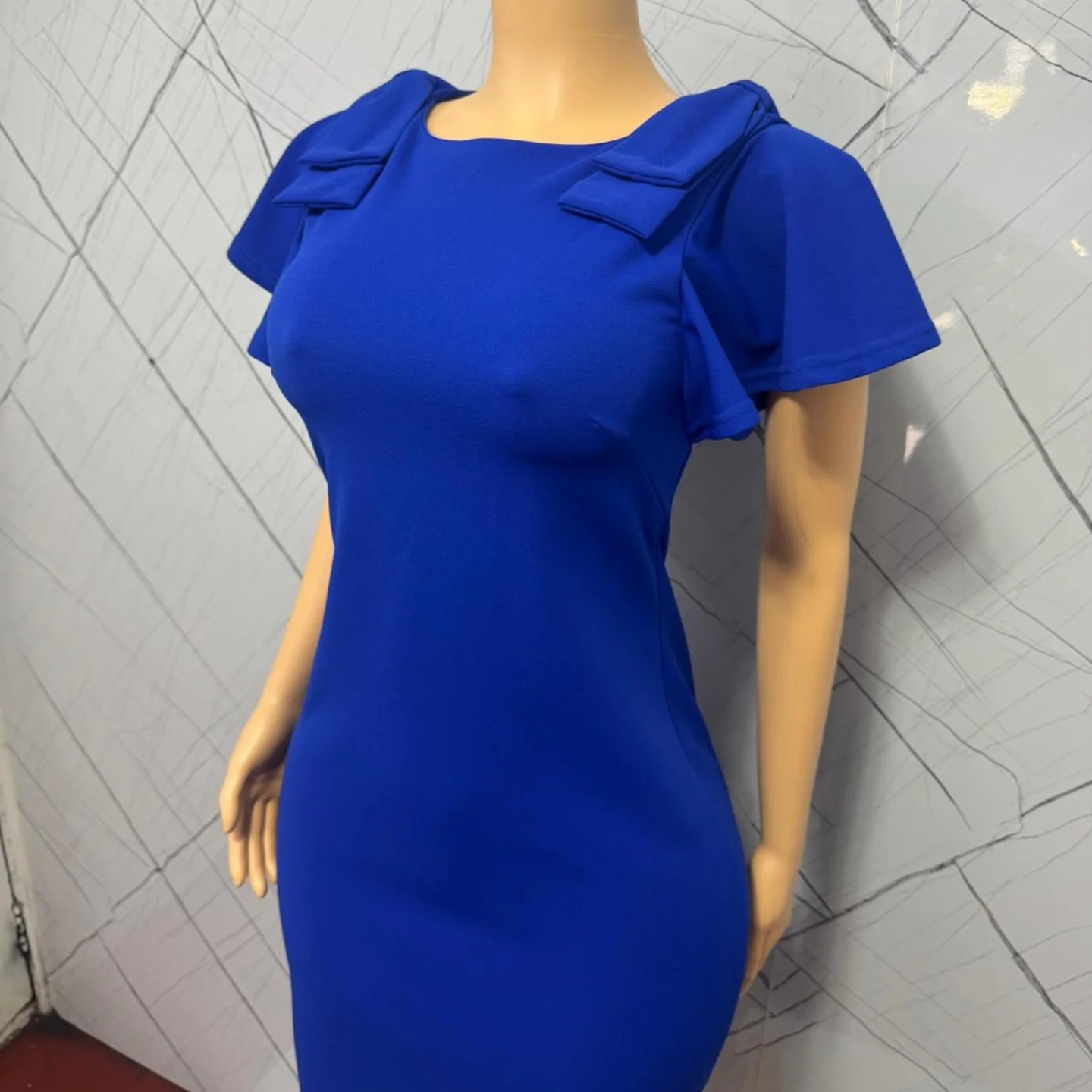 An elegant royal blue women’s dress featuring a fitted silhouette and short flutter sleeves. The neckline is adorned with subtle bow-like details, adding a touch of sophistication. This stylish dress is available in store.