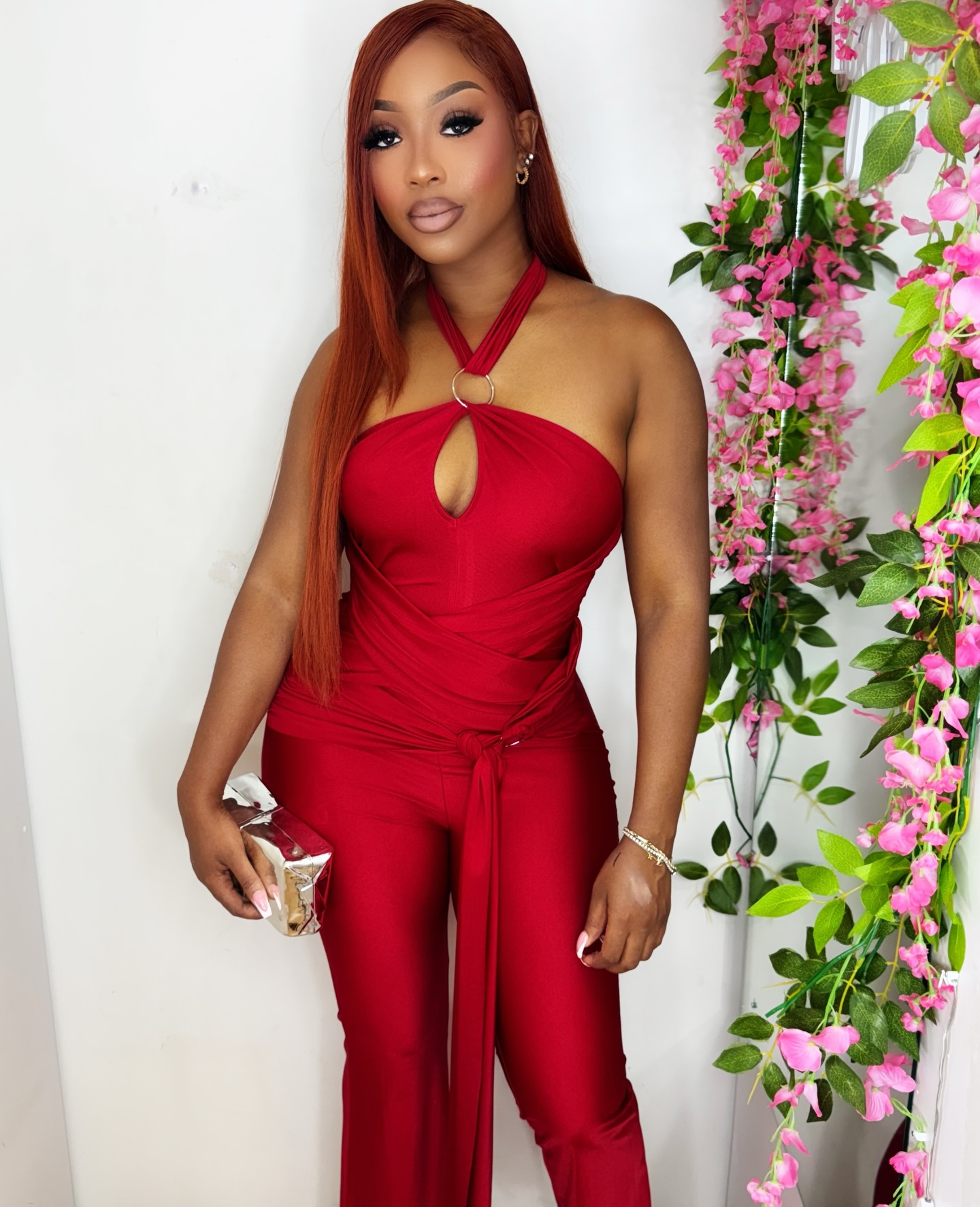 This vibrant red jumpsuit features a halter neckline with a keyhole design and a wrap-around tie detail. It’s available in sizes Small, Medium, and Large, perfect for various fits. The model is showcasing the Small size.