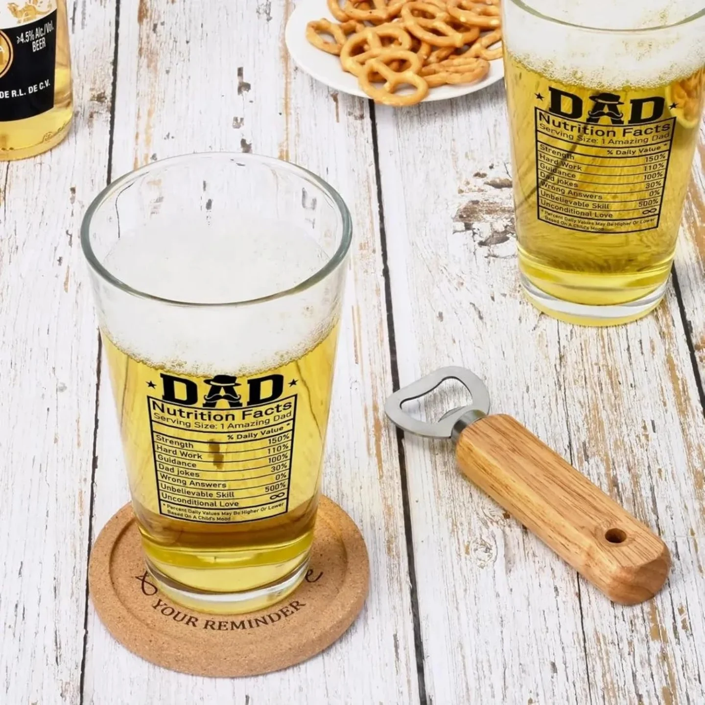 This thoughtful 4-piece gift set for dads includes a 15oz beer glass printed with ‘Dad Nutrition Facts’, a bottle opener with a wooden handle, and a ‘You’re Awesome’ cork coaster. These items are presented in a rustic wooden barrel with a vintage lock, making it an ideal appreciation gift.