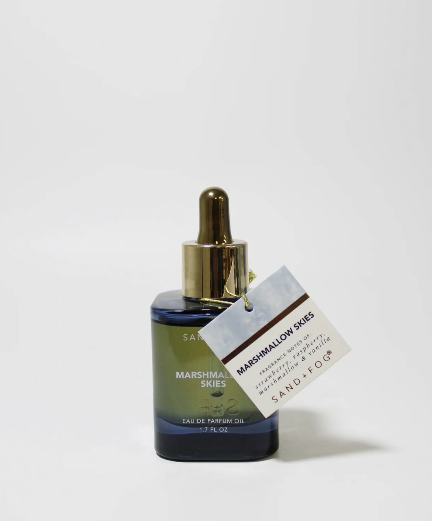 This is the Sand + Fog Marshmallow Skies Eau de Parfum Oil, a fragrance with notes of strawberry, raspberry, marshmallow, and vanilla. The bottle contains 1.7 FL OZ of perfume oil.