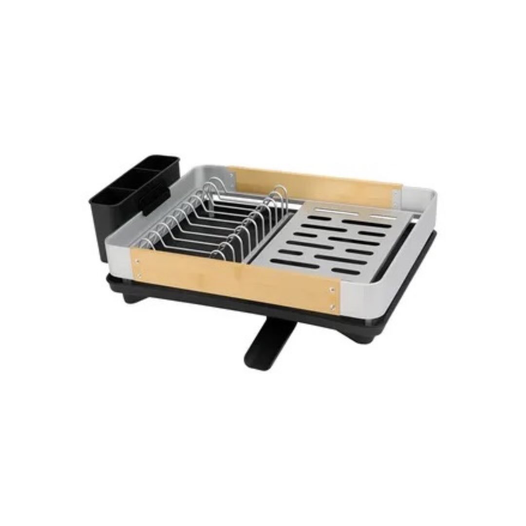 This modern dish drainer features a sleek design with an aluminum frame, natural wood accents, and a black base. It includes a dedicated rack for plates and a removable black utensil holder, making it a practical kitchen essential for drying dishes and cutlery.