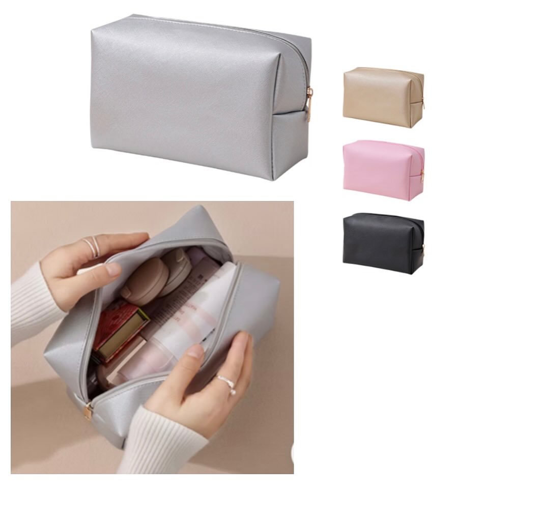 This is a silver cosmetic bag with a zipper closure. It measures 21.5*9*13CM and is perfect for organizing makeup and toiletries. Available in multiple colors.
