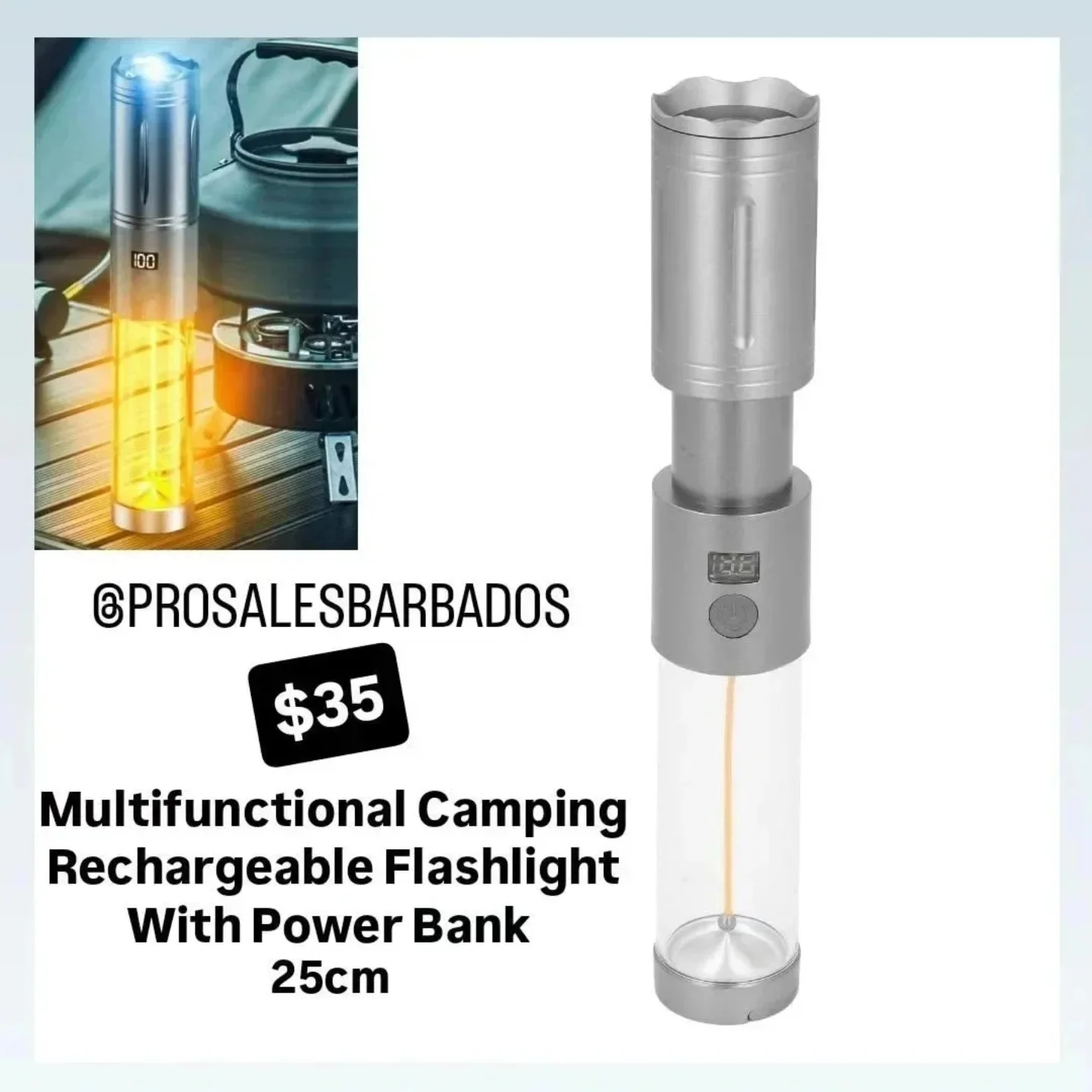This sleek multifunctional camping flashlight features a durable silver design, equipped with a rechargeable power bank. Its compact 25cm size and textured grip make it ideal for outdoor adventures.