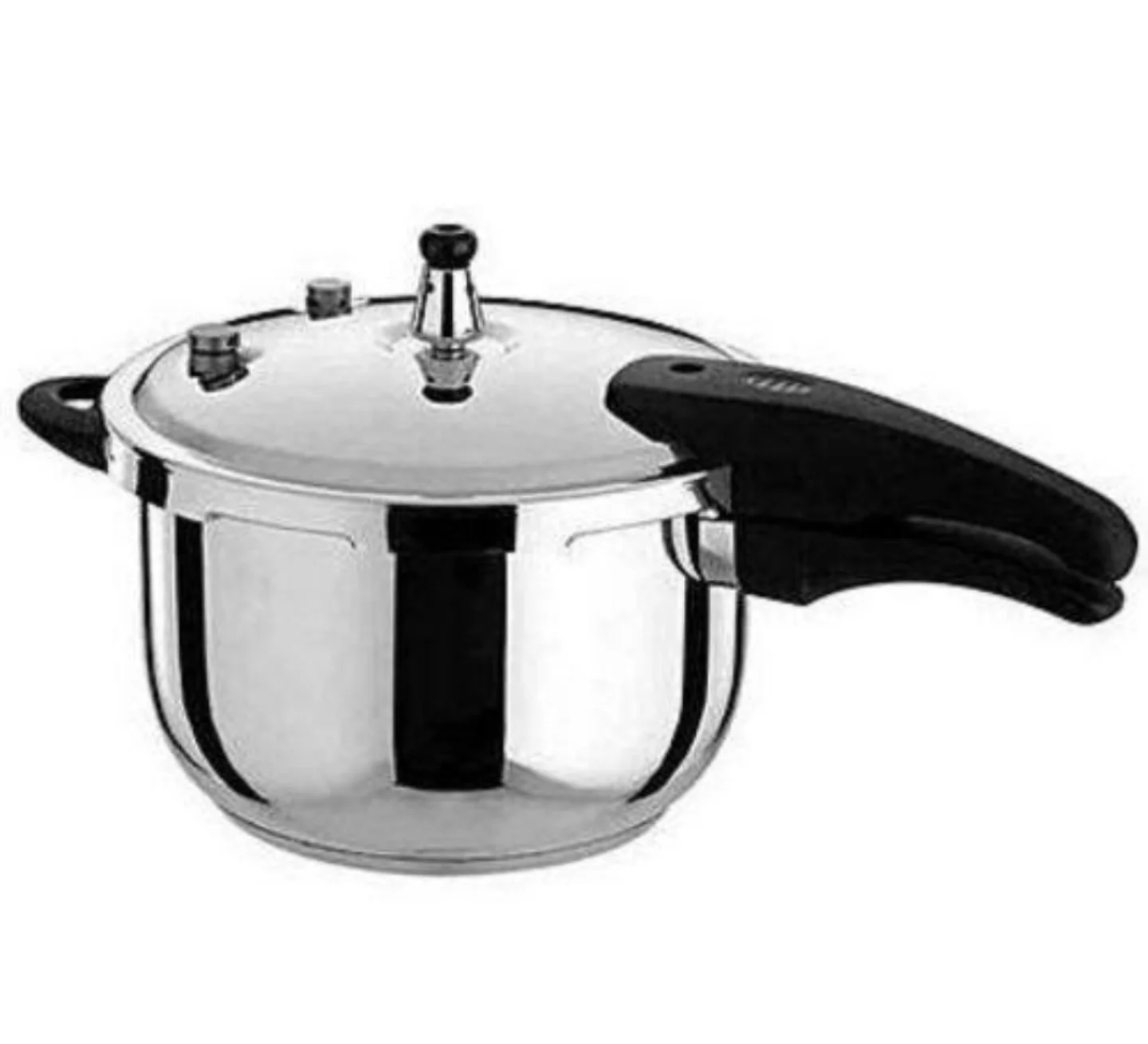 This durable stainless steel pressure cooker is designed for efficient and fast cooking. It features a polished silver finish and a sturdy black handle, making it a practical addition to any kitchen.