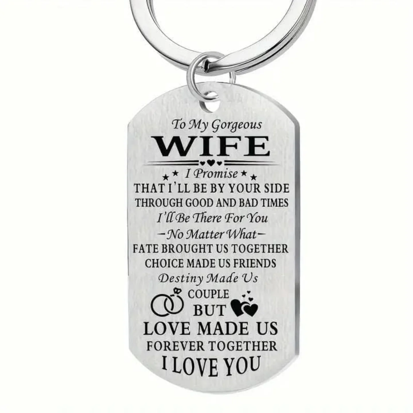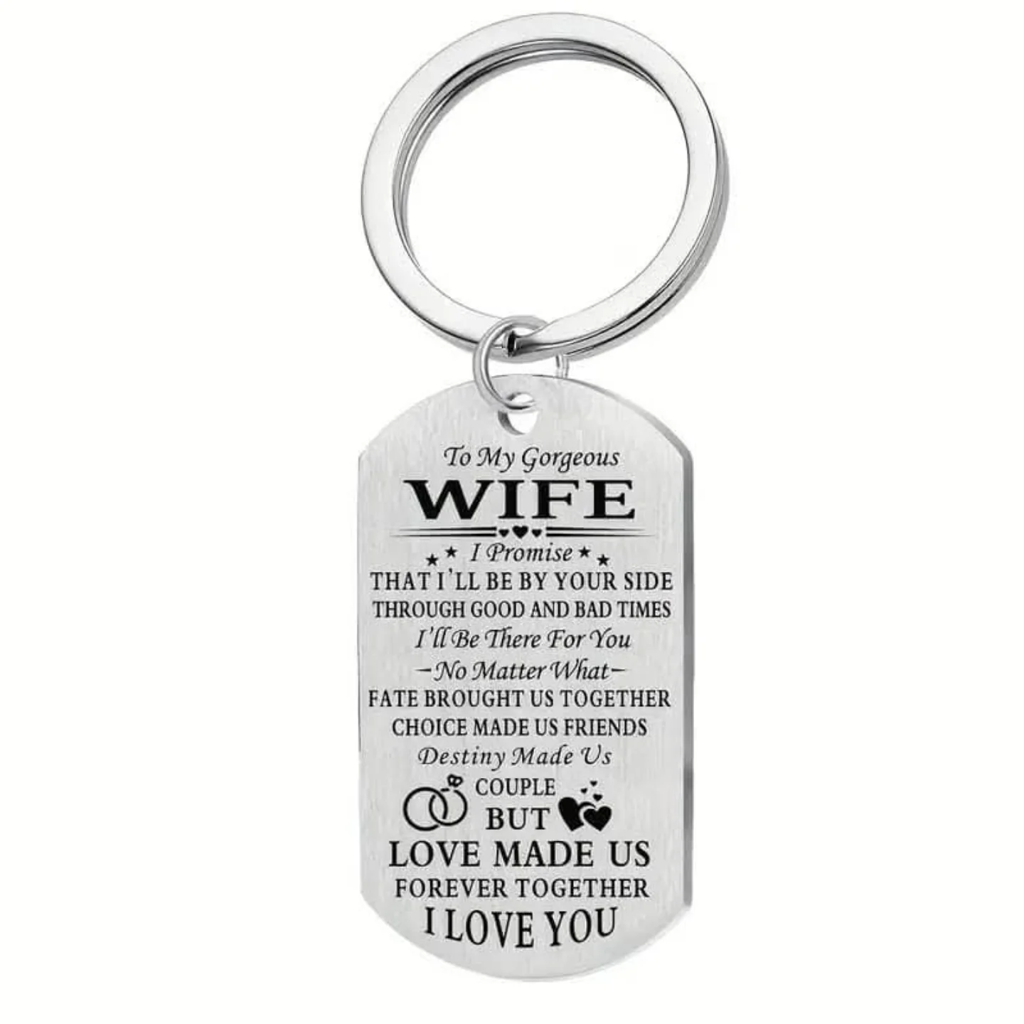 This durable stainless steel keychain features a dog tag design engraved with a heartfelt message ‘To My Gorgeous Wife… I Love You’. It’s a perfect gift to show love and appreciation to your wife for anniversaries, birthdays, or just because.
