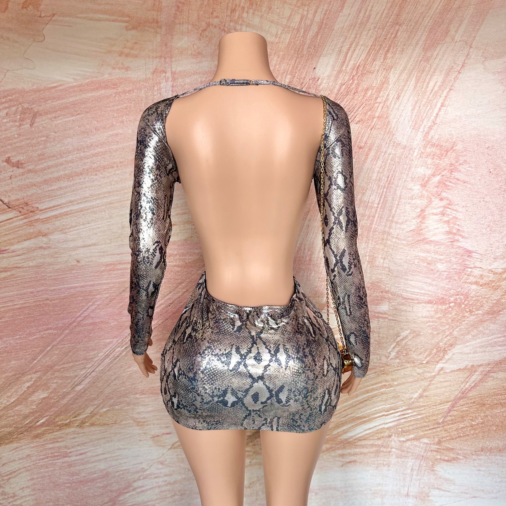 This is a women’s long-sleeve mini dress featuring a striking snake print pattern with a sleek cut-out design on the front. The dress is form-fitting, accentuating the silhouette. Available in sizes S, M, and L.