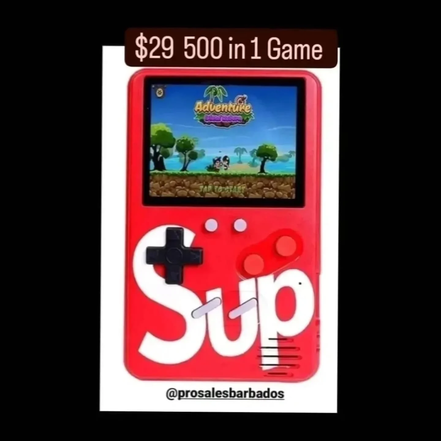 A red portable handheld gaming console, featuring a ‘Sup’ logo, designed for retro gaming. It advertises a library of 29,500 built-in games, offering a wide variety of entertainment on the go.