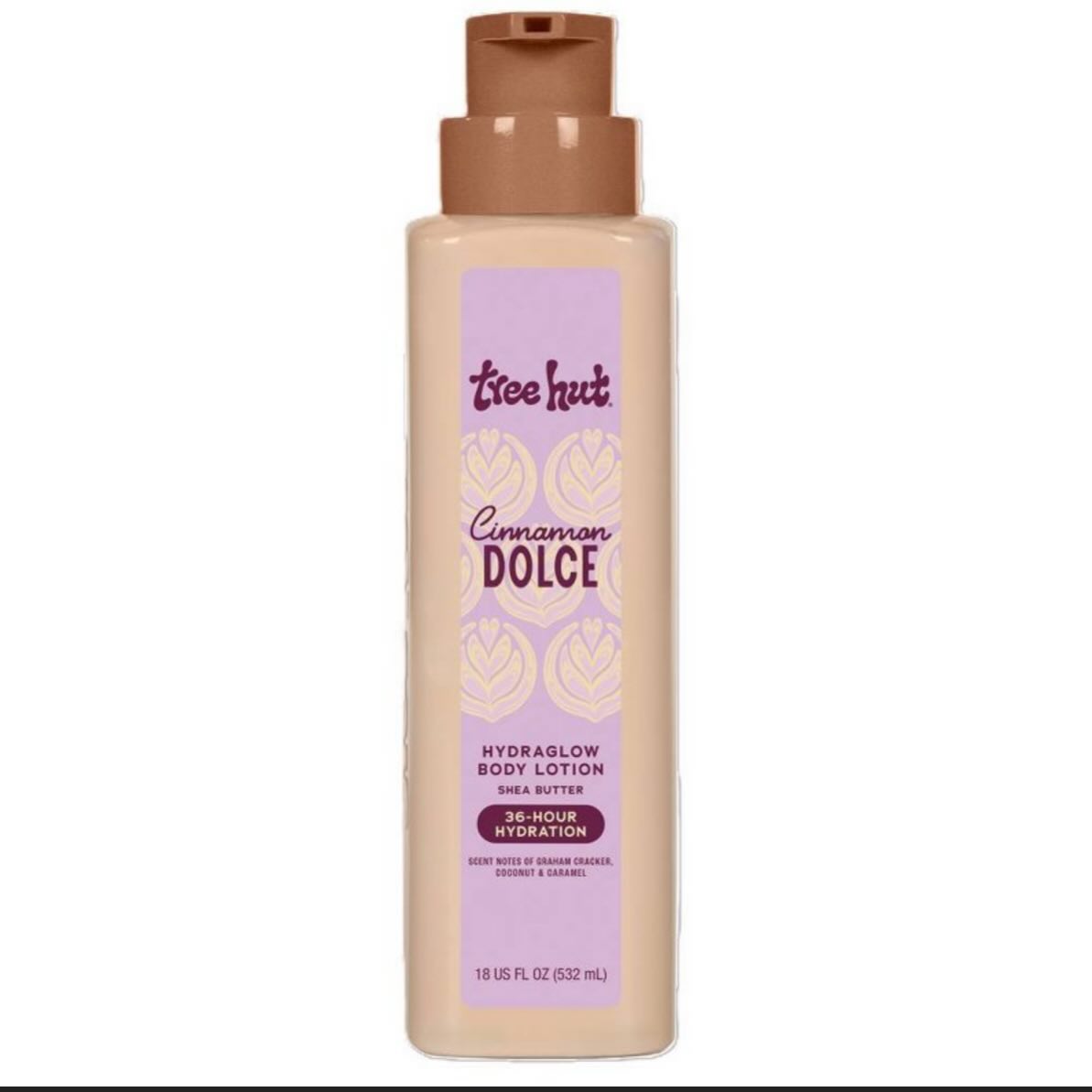 This Tree Hut Cinnamon Dolce Hydraglow Body Lotion is infused with Shea Butter for 36-hour hydration. The scent notes are graham cracker, coconut, and caramel. This lotion comes in an 18 US FL OZ (532 mL) bottle.