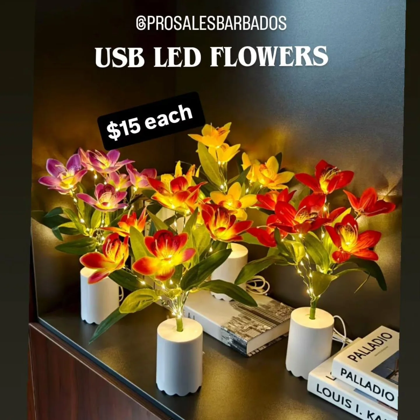 These USB-powered LED decorative flowers come with integrated LED lights in vibrant colors like red, blue, yellow, and white. Each set is housed in a sleek white base, ideal for enhancing any room’s atmosphere.