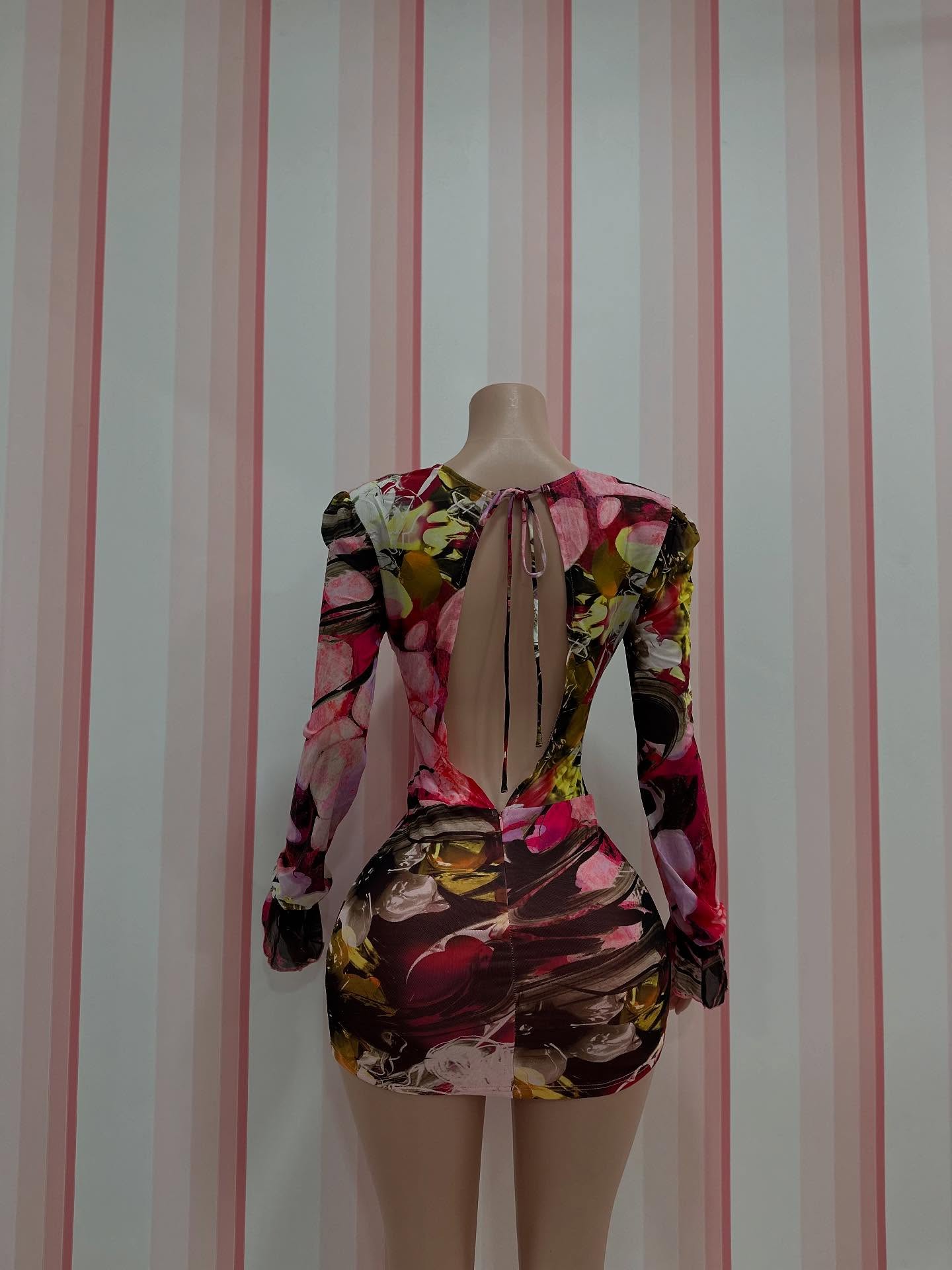 This vibrant multi-color long-sleeve mini dress features a stylish deep cowl neck and elegant flared cuffs. Adorned with an eye-catching abstract pattern, this bodycon dress is perfect for a night out. Available in small, medium, and large.