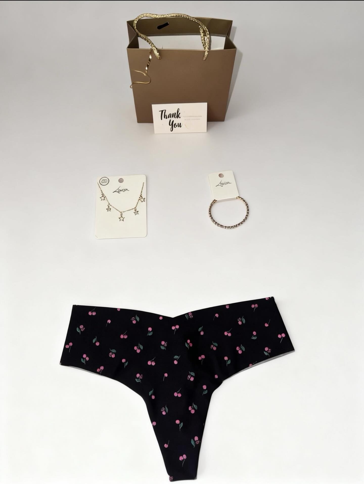 This Christmas gift set includes a Victoria Secret panty with a playful cherry print, a delicate necklace featuring star-shaped charms, and a stylish bracelet. Perfect for a festive surprise.
