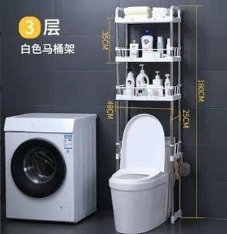 This white 3-tier storage shelf is designed to fit over your toilet, providing convenient bathroom organization. It features multiple shelves to hold toiletries, towels, and other bathroom essentials. The dimensions are 180cm in height, with shelf heights of 35cm and 48cm.