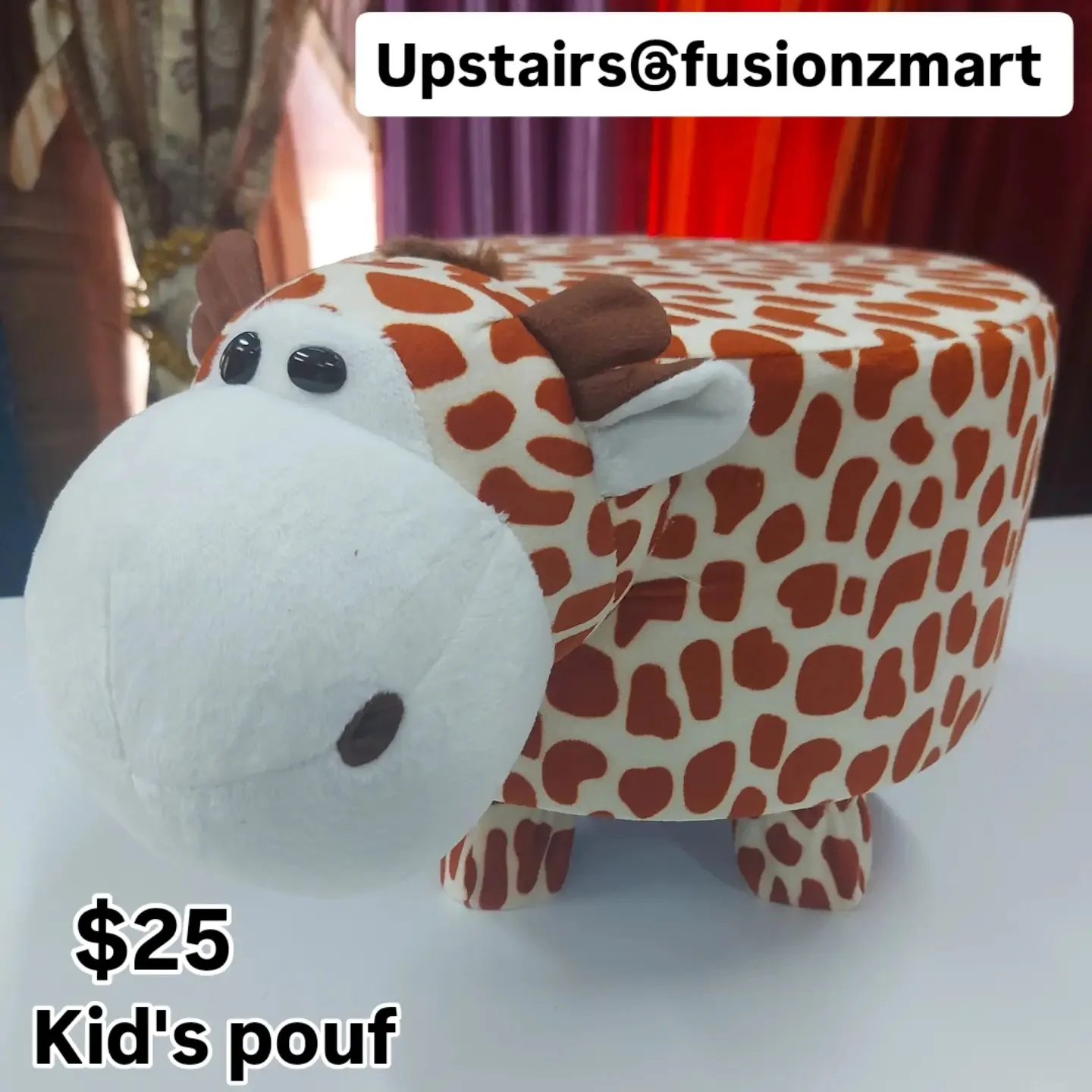 A charming children’s pouf designed with a playful giraffe motif. This plush ottoman features a soft white face and a distinctive brown and white spotted pattern, making it an ideal fun seating or footrest option for a child’s room or play area.