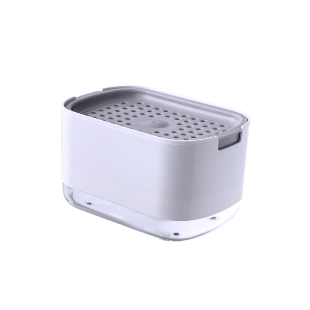 A compact white dish soap dispenser featuring a clear base and a grey perforated top designed to hold a sponge. This kitchen essential helps keep your sink area tidy and dispenses soap efficiently for dishwashing.