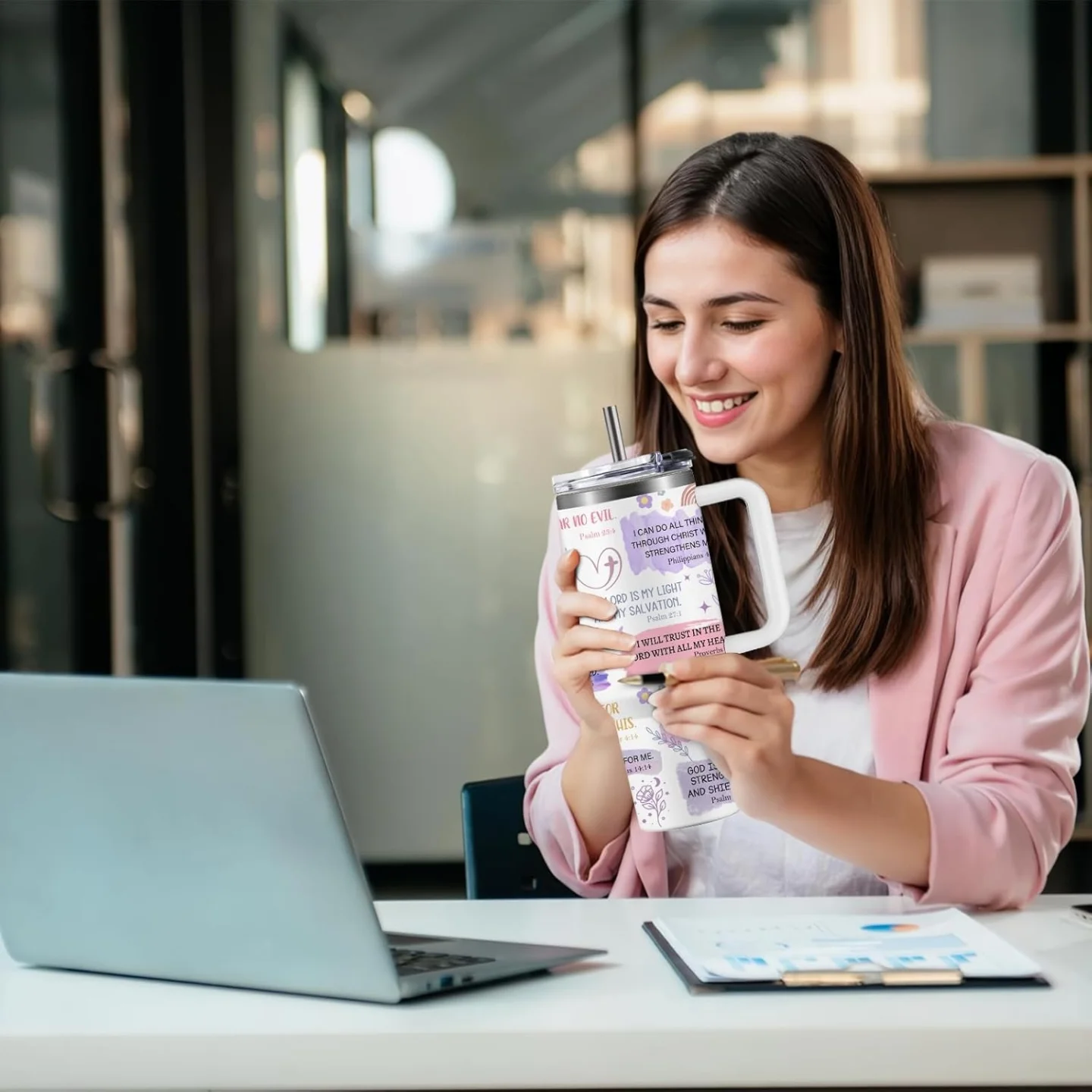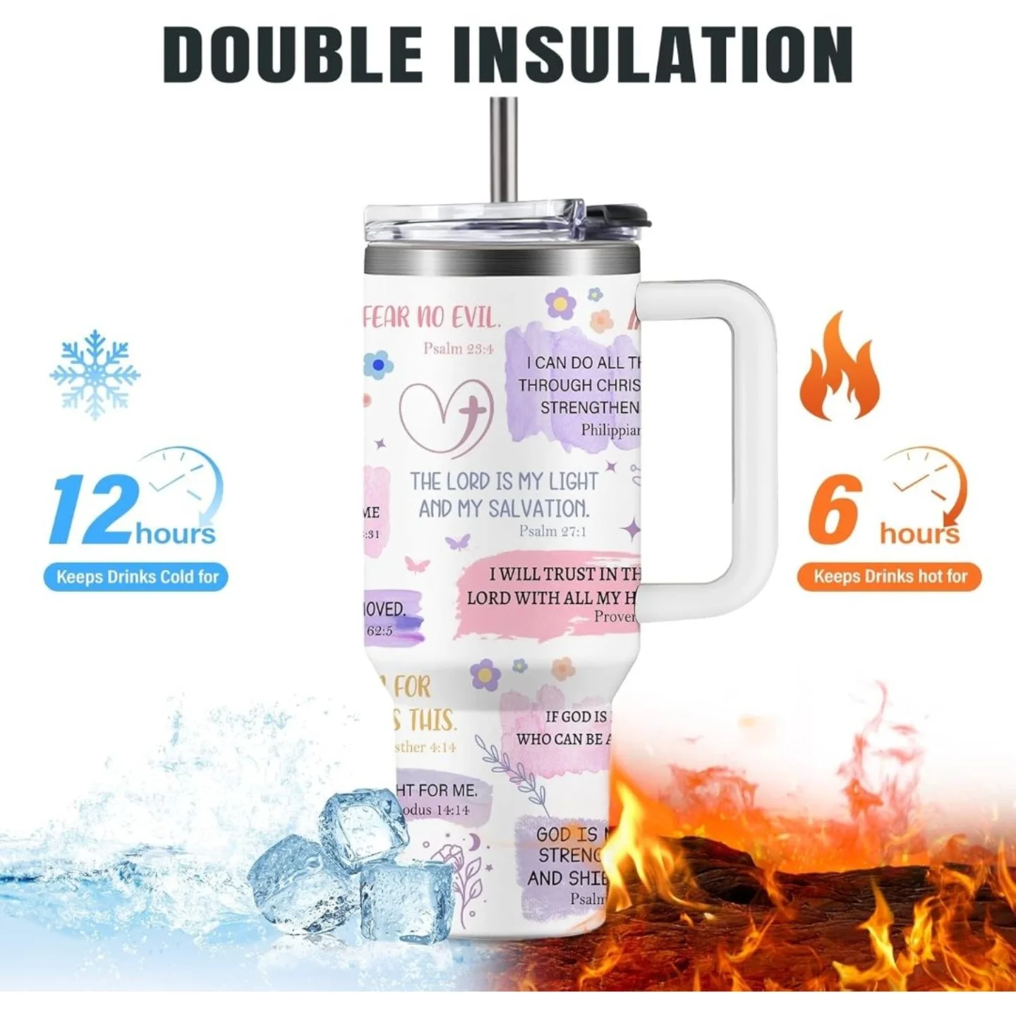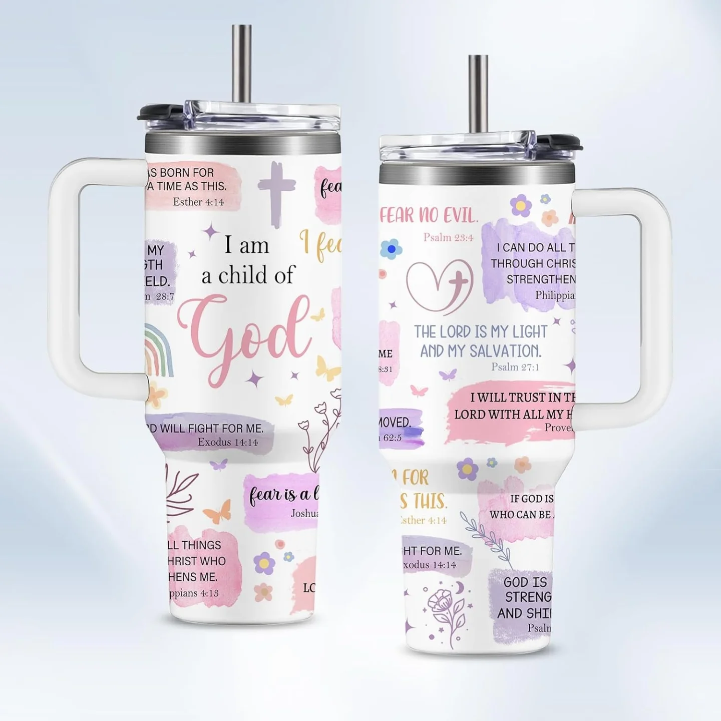 This 40oz white stainless steel travel cup features a ‘I Am A Child of God’ daily affirmation design with various pastel bible verses, flowers, and butterflies. It boasts double-wall vacuum insulation to keep beverages hot or cold, complete with a convenient handle and lid, making it a meaningful and practical gift.