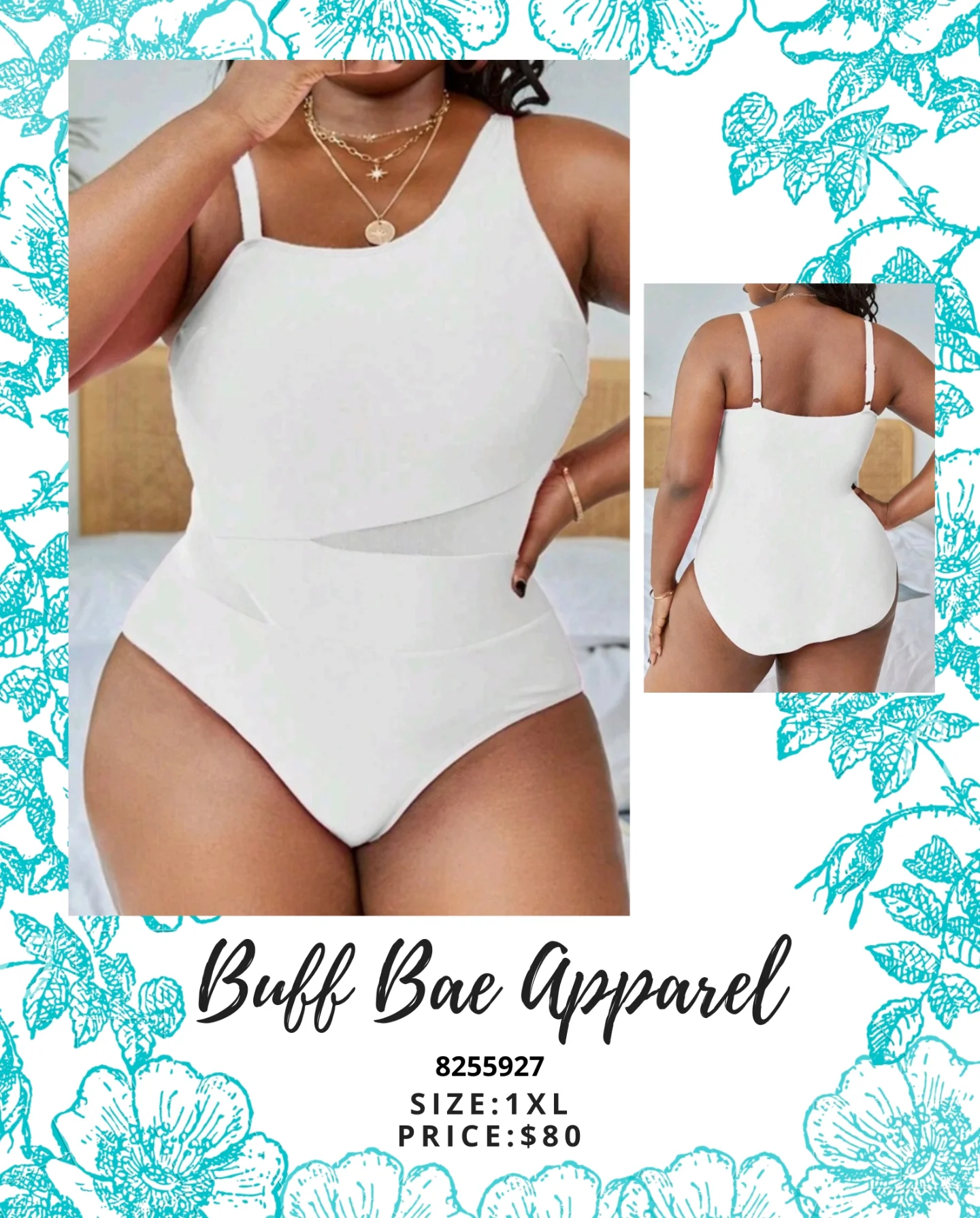 This white one-piece swimsuit features a mesh insert detail and adjustable straps. Designed for a flattering fit, it is available in size 1XL. This stylish swimwear is perfect for your next vacation or beach day.
