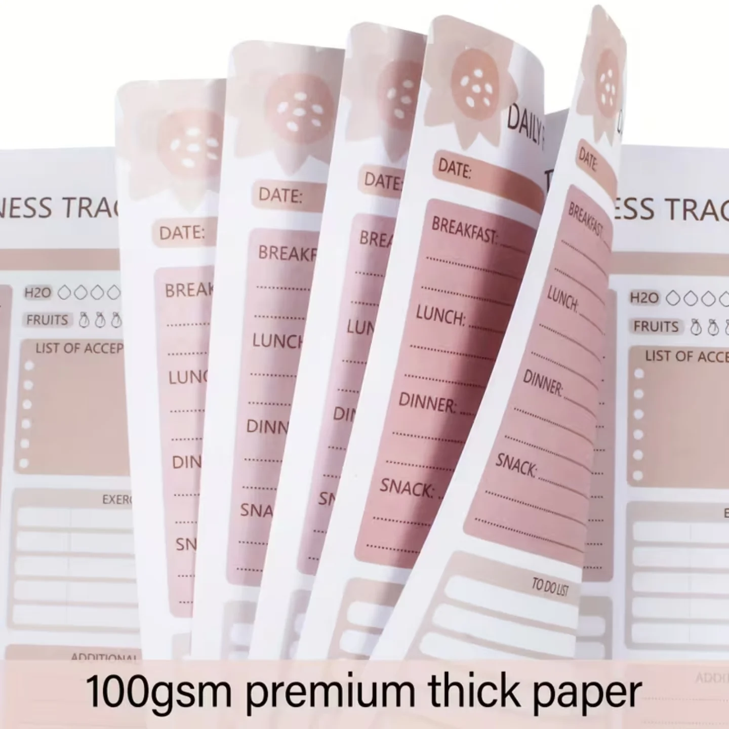 This spiral-bound daily planner features a clean white cover with delicate pink floral outlines and gold spiral binding. It’s designed to help you keep track of your fitness goals, daily activities, and financial planning. The planner includes multiple sheets of colorful stickers for easy organization of bills, paydays, goals, travel, and other important events.