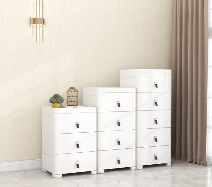 This is a white plastic drawer cabinet. It features multiple drawers with dark handles, suitable for storage. The cabinet is modular and comes in different heights, with options for 3, 5, or 7 drawers.