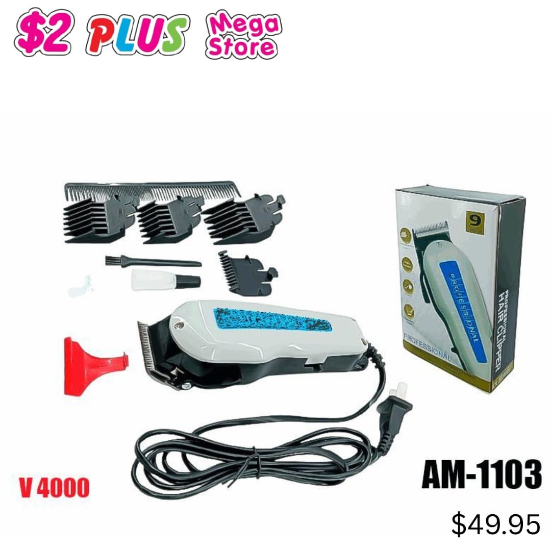 This is a professional hair clipper, model AM-1103. It comes with multiple comb attachments for different cutting lengths, a cleaning brush, and oil. The clipper features a white body with a blue accent and a power cord. Ideal for barbers and home use.