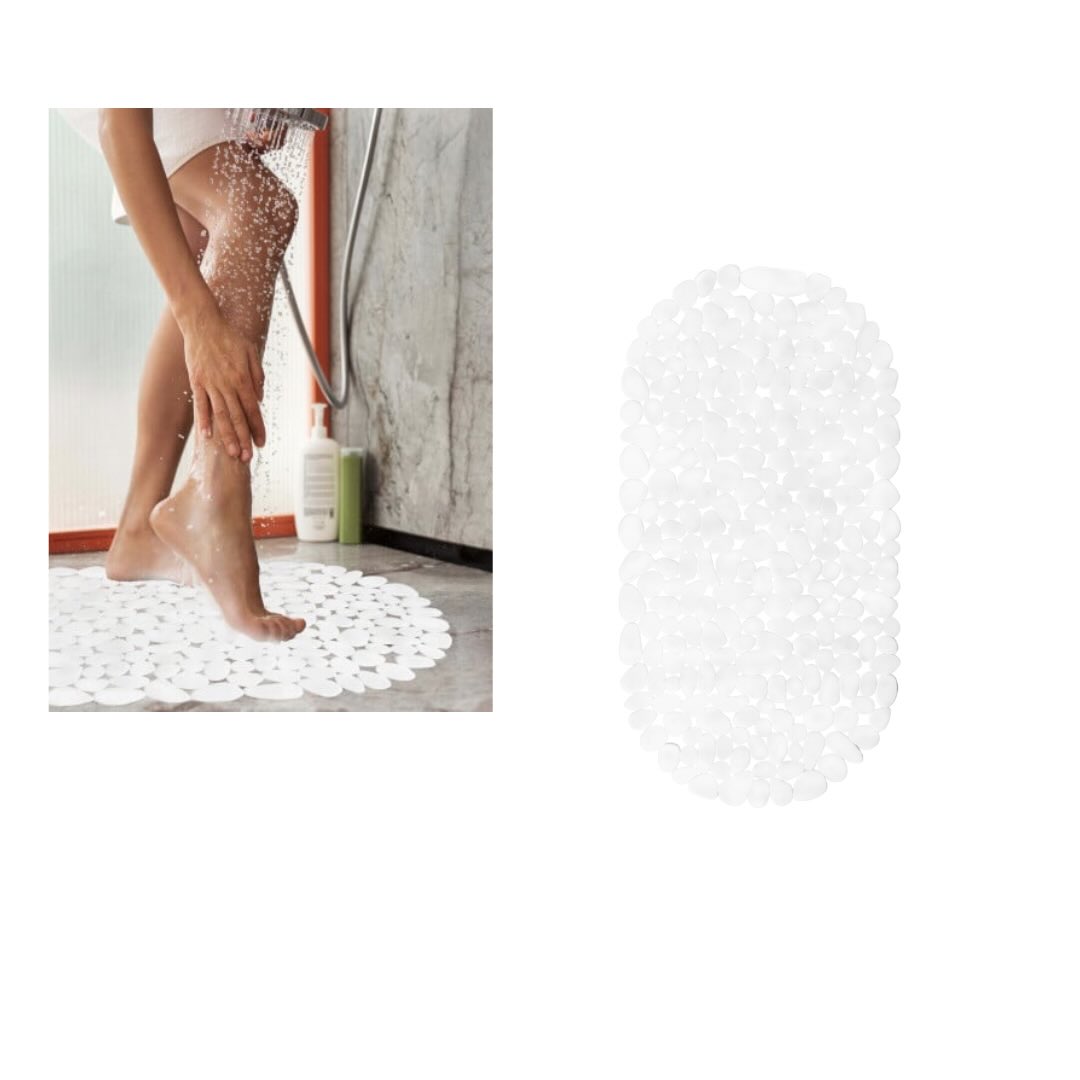 This white rubber shower mat features a textured, pebble-like design for enhanced grip and safety in the shower. Made from durable rubber, it measures 35x68cm, offering a practical and non-slip solution for your bathroom.