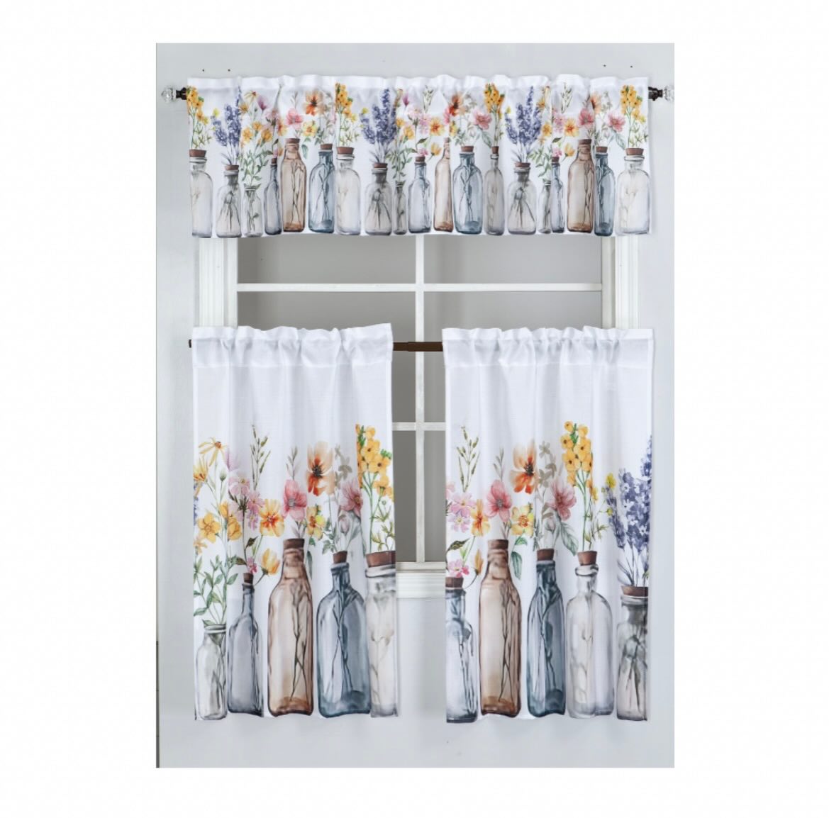 This charming 3-piece kitchen curtain set features a delightful print of colorful wildflowers arranged in various vintage-style bottles. The set includes a valance and two tier curtains, perfect for adding a touch of rustic elegance and privacy to your kitchen window.