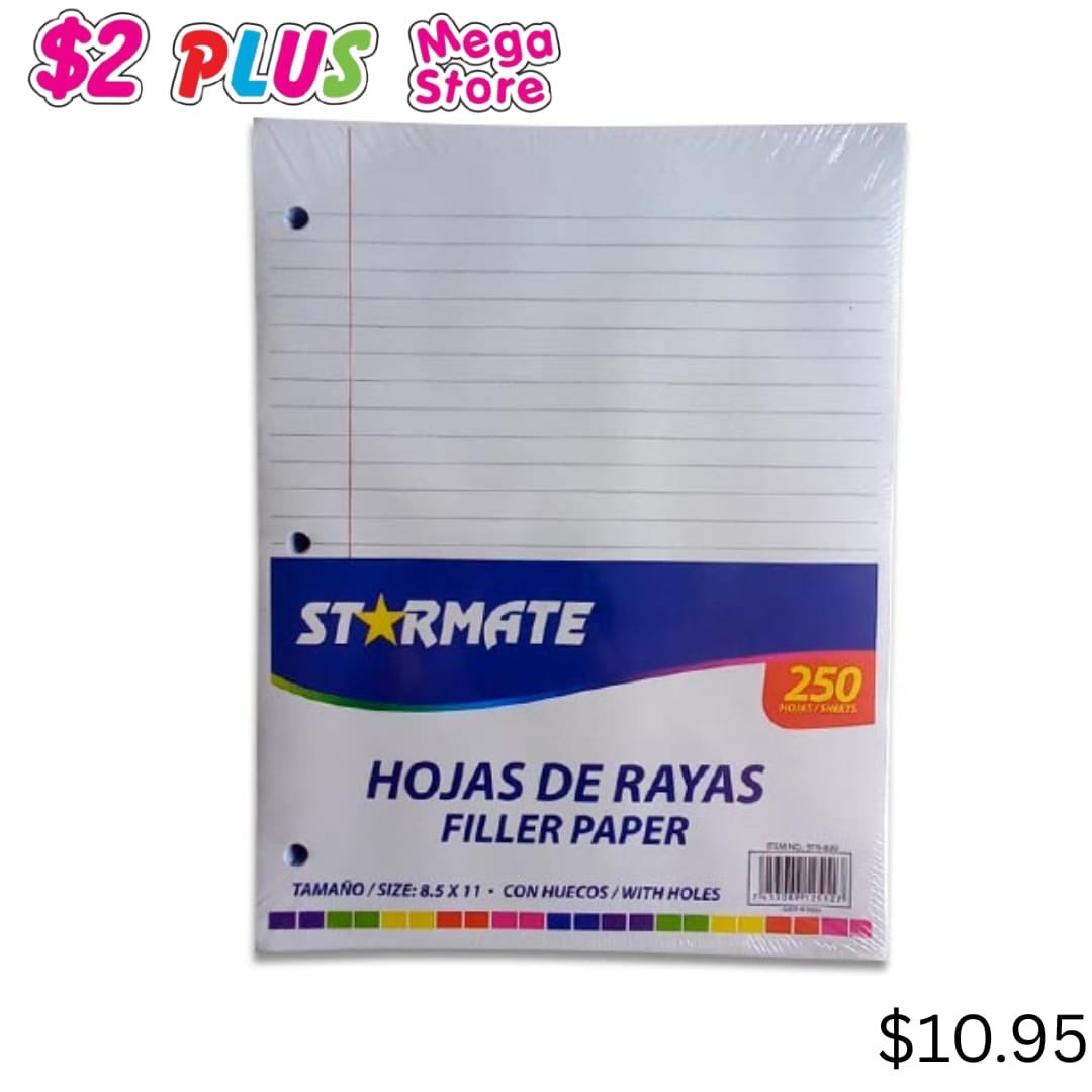 This STAR MATE lined filler paper is ideal for students and professionals. Each pack contains 250 sheets of standard 8.5 x 11 inch paper, featuring three pre-punched holes for convenient use in binders and folders.
