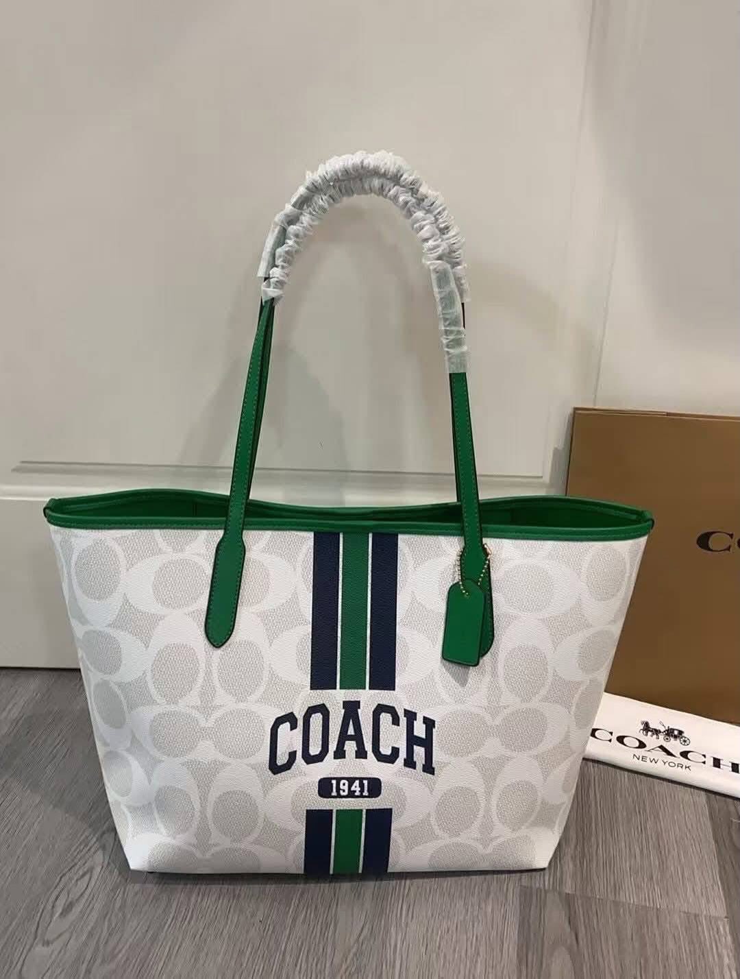 This stylish COACH tote bag features a white signature ‘C’ pattern canvas with bold navy and green vertical stripes and ‘COACH 1941’ branding. It is accented with vibrant green handles and trim, making it a chic and spacious accessory for everyday use.