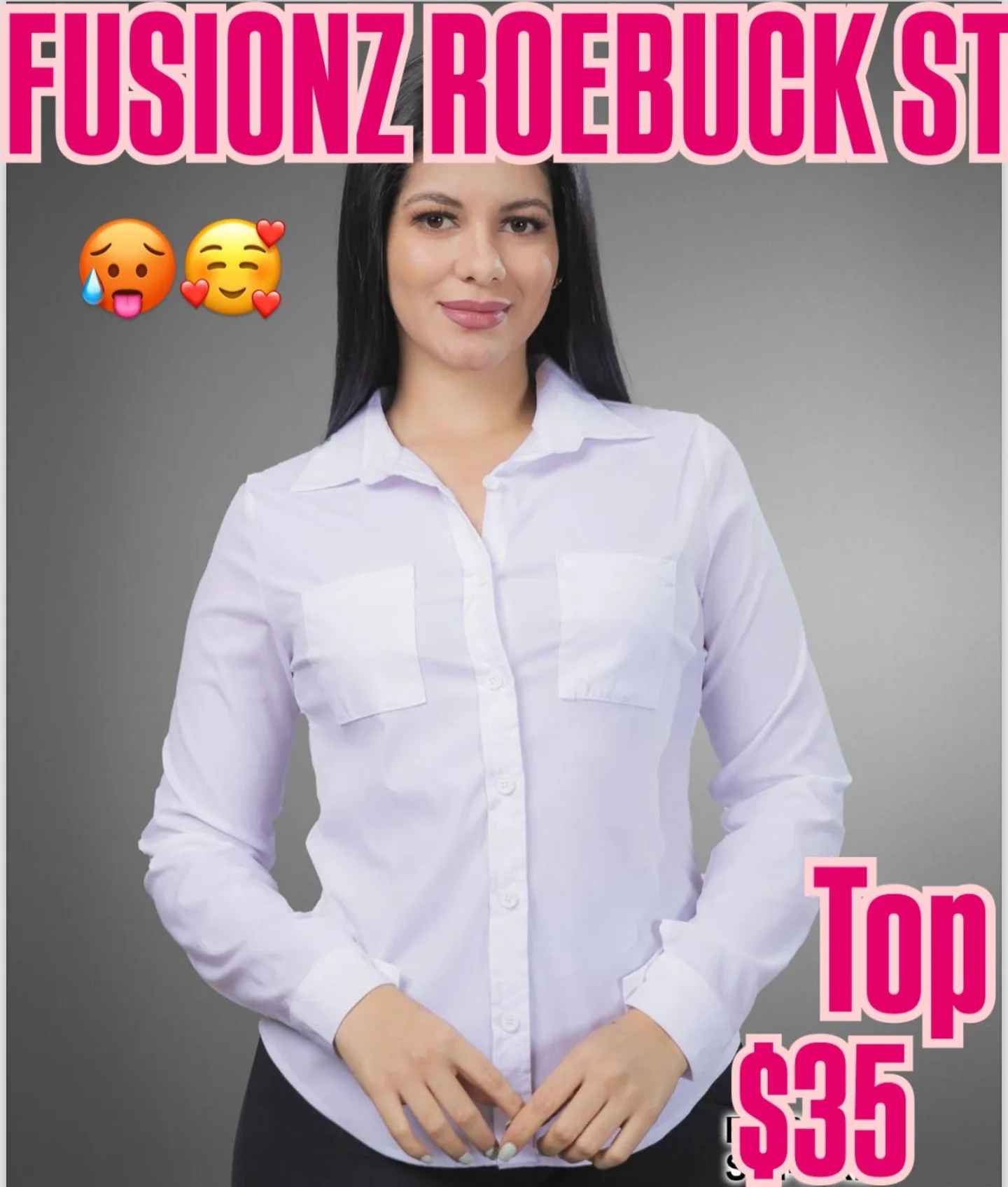 This crisp white long-sleeve top is ideal for a polished look. Designed for women, it features a classic button-down front and dual chest pockets.