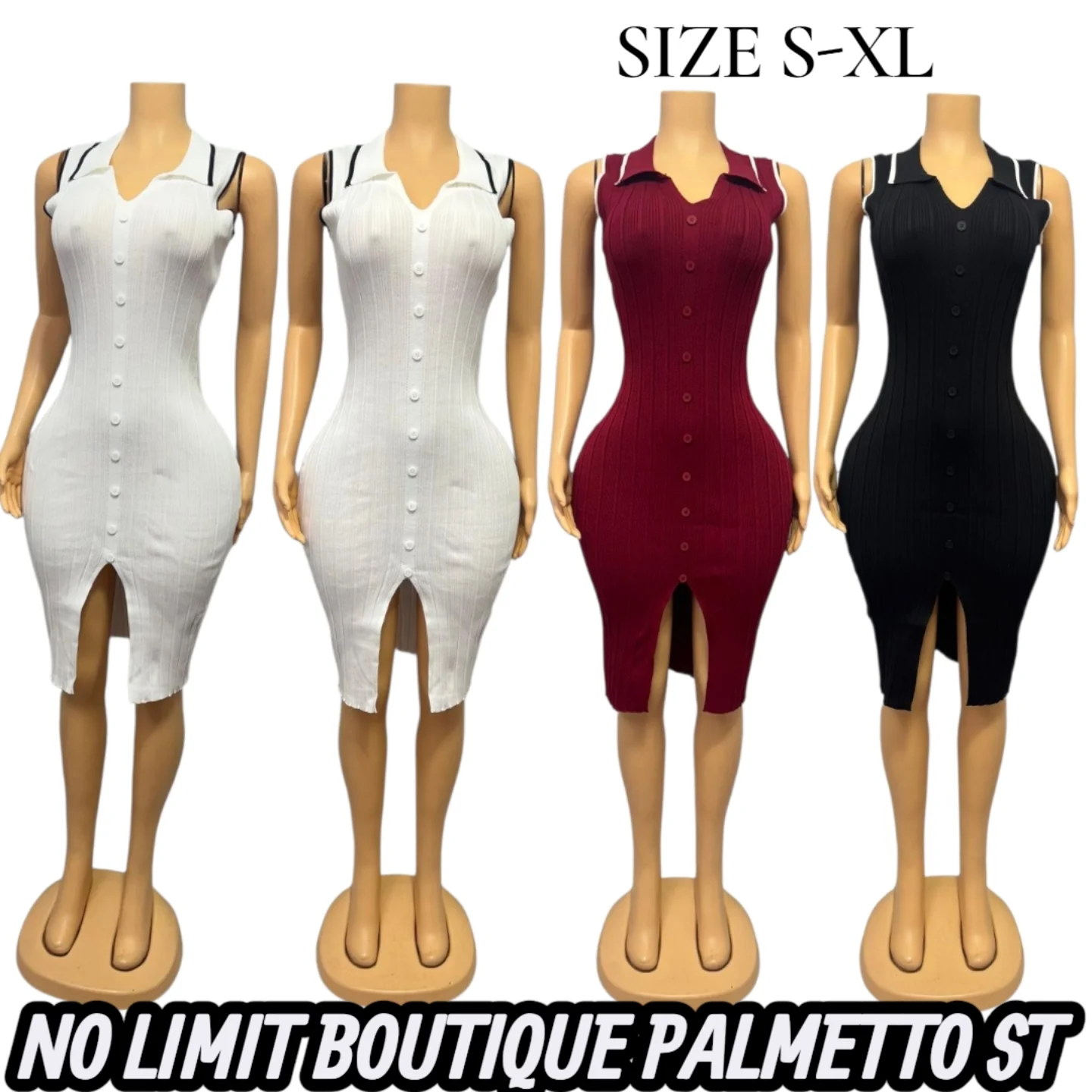 This women’s ribbed midi dress features a button-up front and a collared neckline. It is sleeveless with a front slit. Available in sizes S-XL. This dress is perfect for a stylish and comfortable look.