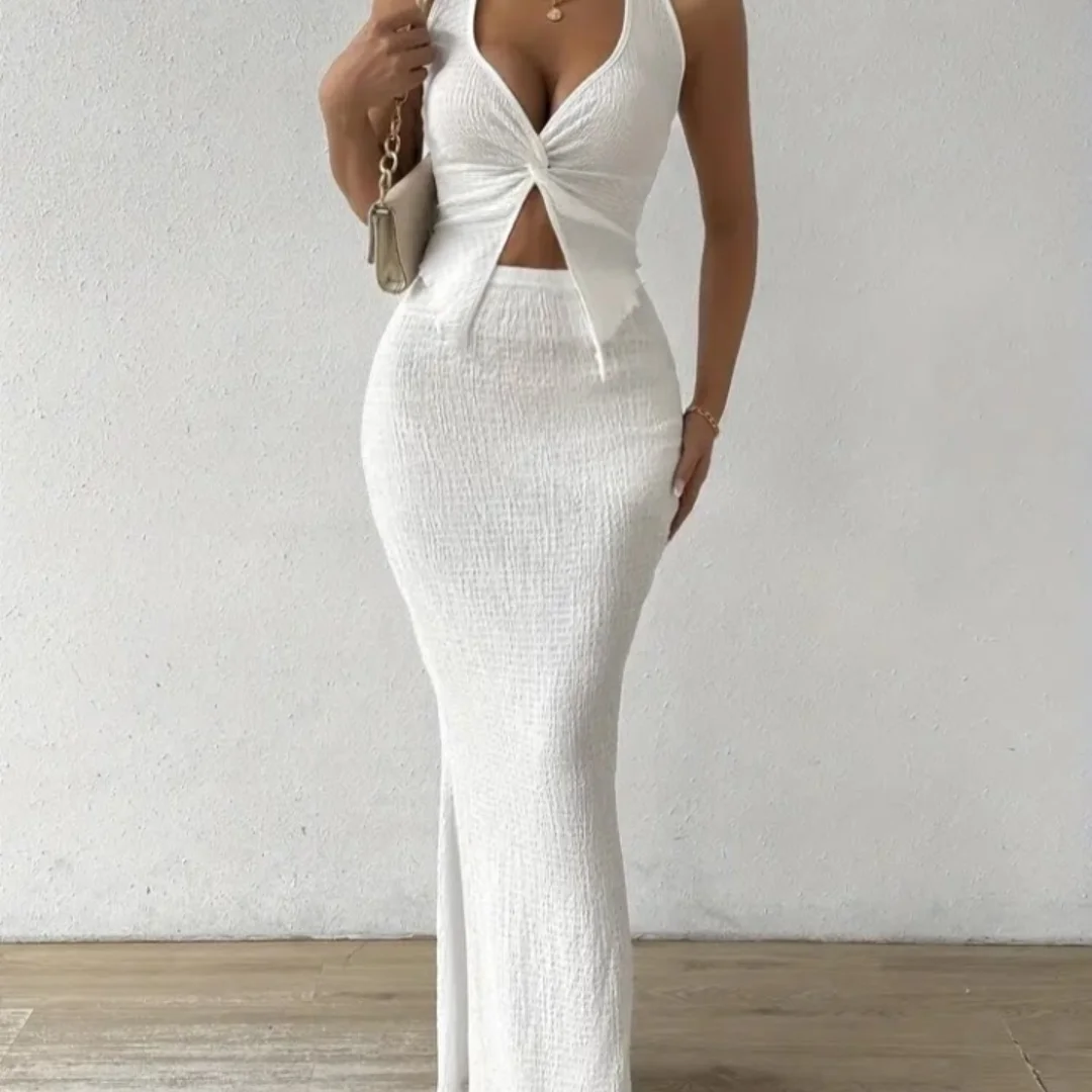 This elegant white two-piece set for women features a stylish halter neck crop top with a twisted front detail and a matching long, textured skirt. Perfect for casual wear, this trendy outfit is available in multiple sizes.