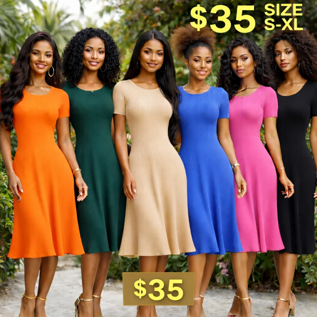 This women’s midi dress features a ribbed knit texture and short sleeves. Available in multiple colors and sizes S-XL. Perfect for a casual or dressed-up look.