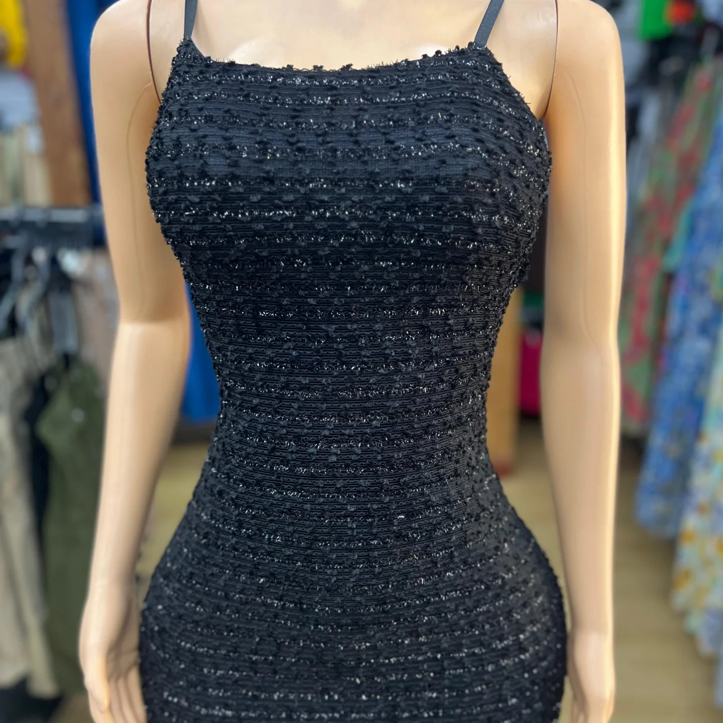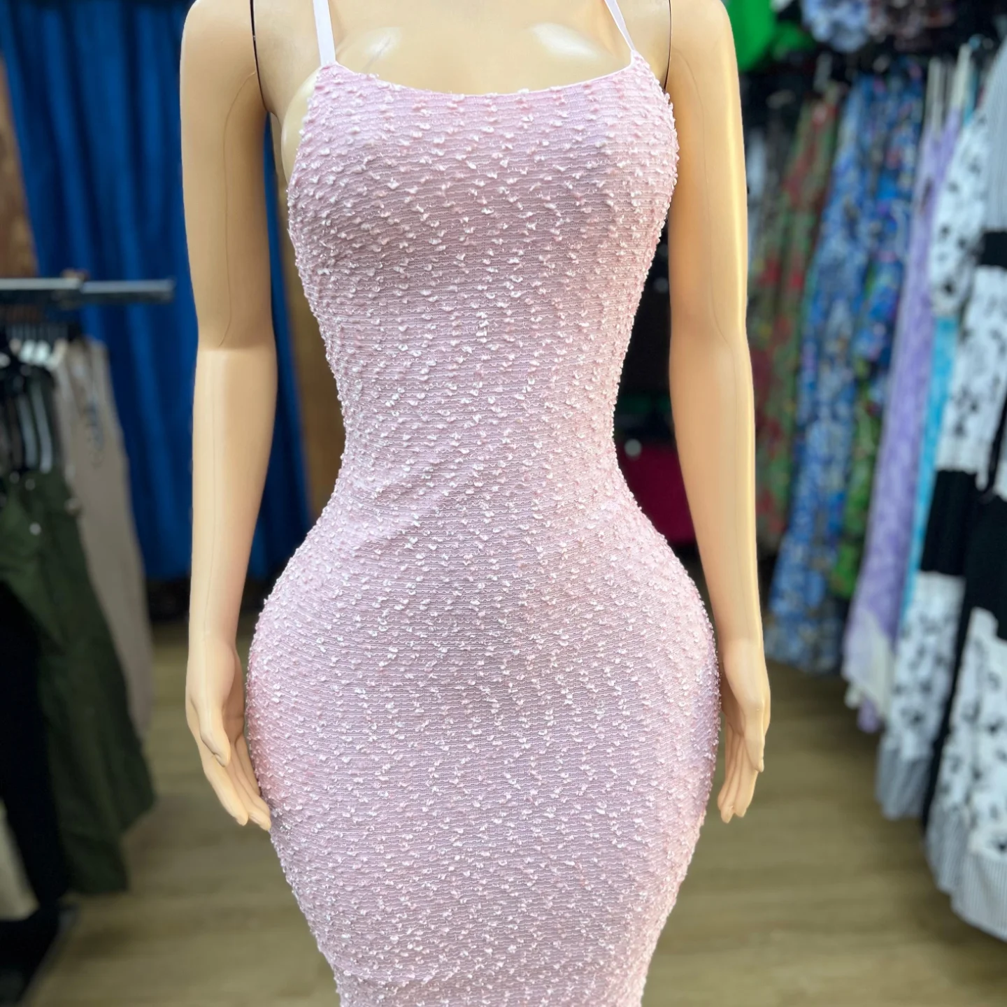 This collection features sleeveless bodycon dresses in various colors – pink, black, beige, and blue. Each dress has a fitted style with a textured pattern, suitable for various occasions. Ideal for those looking for stylish and form-fitting apparel.