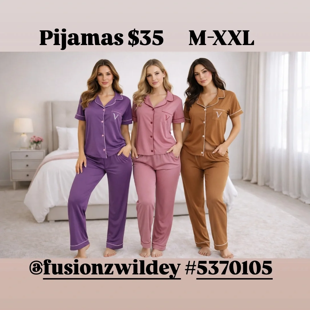 This comfortable two-piece women’s pajama set features a short-sleeve button-up top with a notched collar, chest pocket with ‘V’ embroidery, and contrasting white piping. It comes with matching long pants, crafted from a soft knit fabric, perfect for lounging or sleeping. Available in sizes M-XXL.