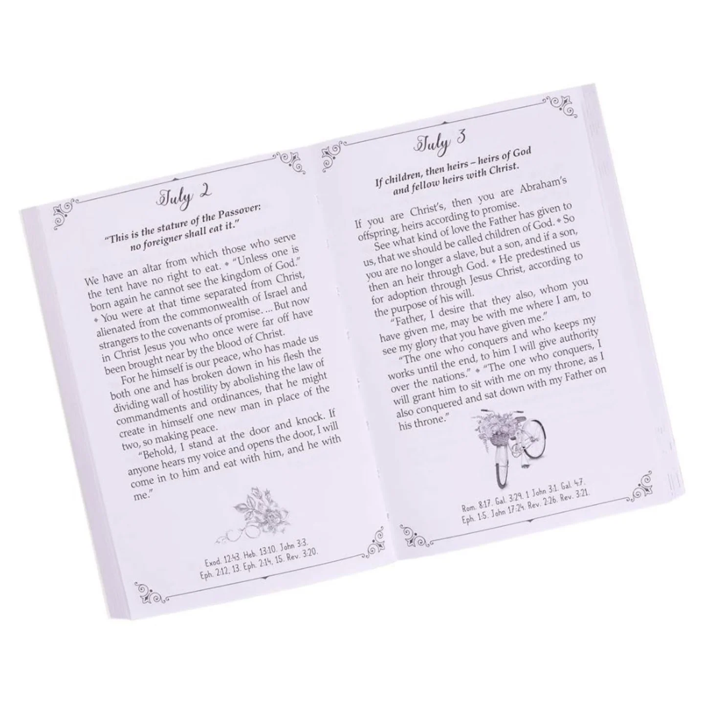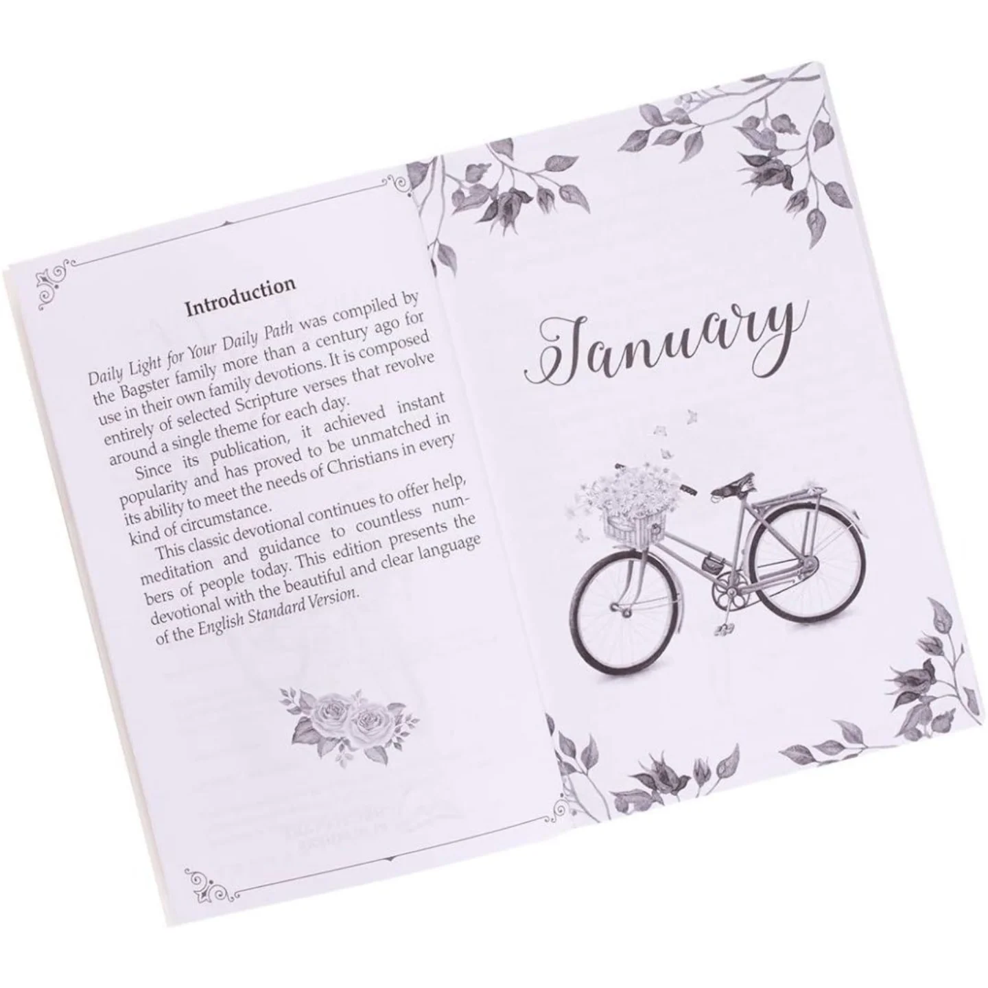 This blush pink devotional book from the Words of Faith Range features a charming vintage bicycle illustration with gold-foiled accents on its cover. It contains 408 pages of curated English Standard Version (ESV) Scripture verses, designed to provide daily inspiration and guidance. Measuring 6″ x 4″ x 0.8″, it’s an ideal gift for spiritual encouragement.