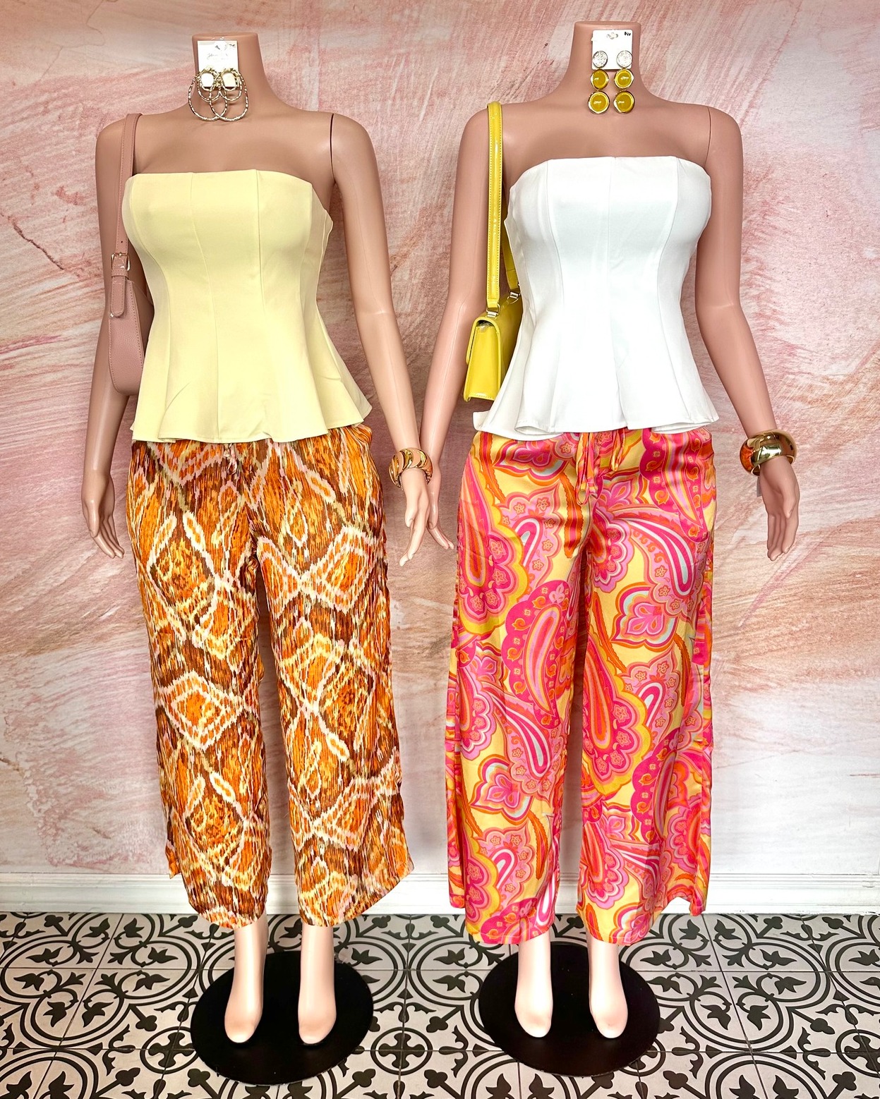 This is a women’s yellow peplum strapless top. It is a versatile piece that can be paired with various bottoms. Available in sizes S, M, and L.